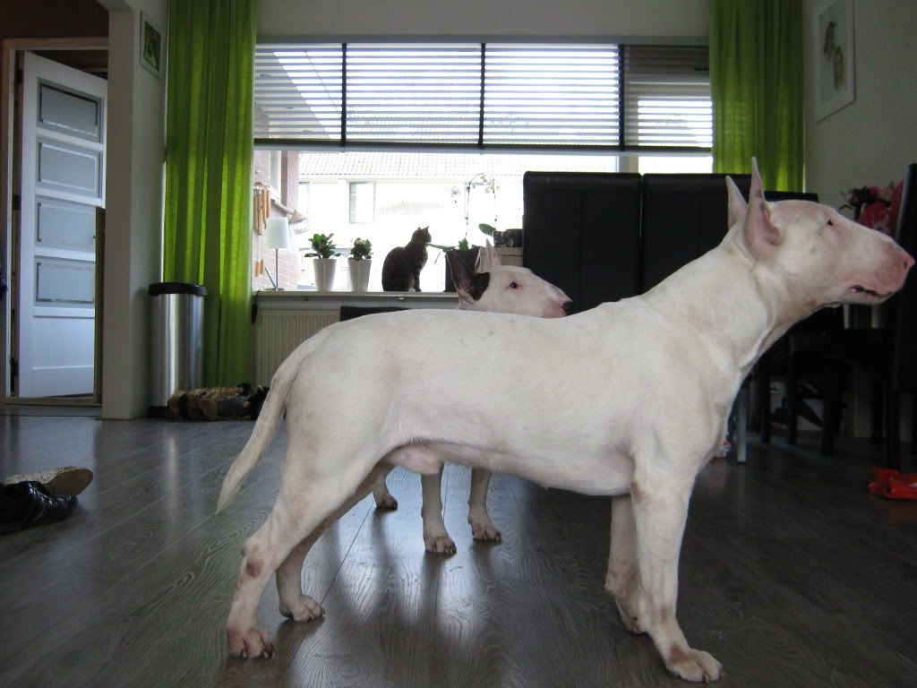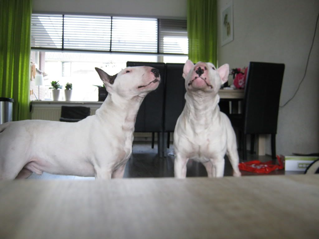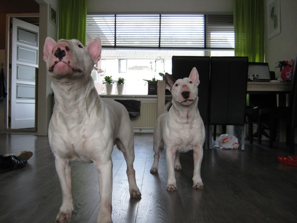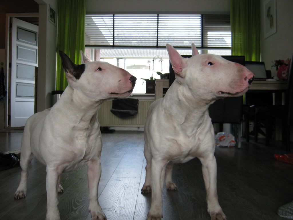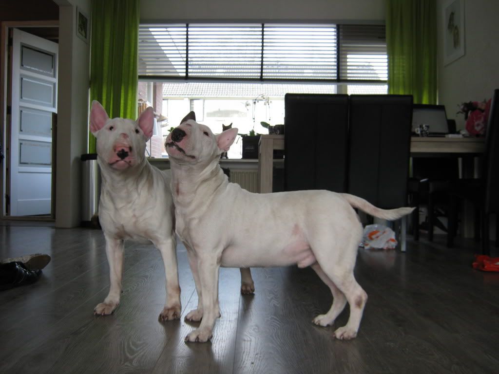zijn mooie bulls .onze vrienden hebben er ook een gelijkt op die van u is een kastaar ze.die vlekken zou dat niet komen van het spelen samen.zou het in de gaten houden mischien gaat het van zelf weer weg.vriendelijke groeten petra