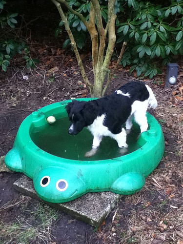Wij hebben in onze tuin een soort mini honden-zwembadje, en toen gooide ik de tennis bal erin, en toen wilde Sam in het water maar hij durfde niet heel goed! En langzamerhand ging hij er stapje voor stapje zelf in, wij hebben hem echt niet gedwongen!
