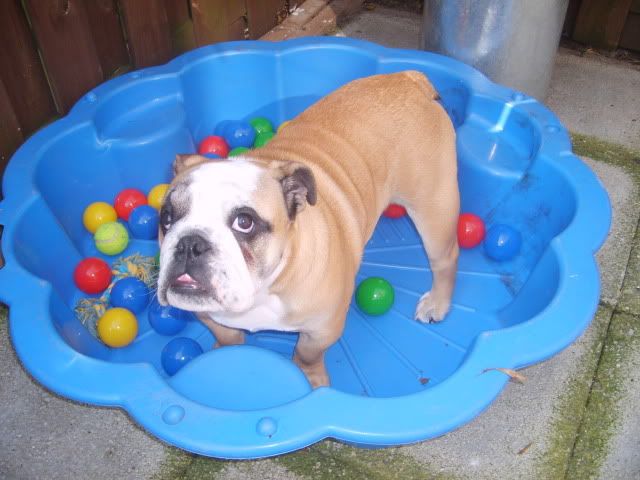 hhahahah die kop ook altijd die hij trekt hee. ik vind dat hij pas goed is gaan groeien sinds hij bij jullie zit. toen je hem net had van de fokker vond ik hem veel te klein en iel. en nu een mooie gezonde prachtbull. leek wel of de fokker uitspaarde met goed eten. en hij zal vast genieten van zijn bad met ballen toch. gr myriam
