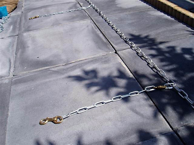 Er bestaan speciale "schroef"-pinnen met dan weer een speciaal "oog" voor aan de lijn zodat de koord zich niet eromheen wikkelt enzo. Toch mag je een hond die zo vastgelegd is niet uit het oog verliezen. Ze zijn vindingrijk om te ontsnappen... kunnen zich toch vastlopen... de zon draait sneller dan je denkt zodat ze niet meer in de schaduw liggen...