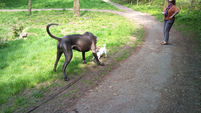 net met de baasjes gaan wandelen en we kwamen een heuse Deense Dog tegen! en ik was heulemaal niet bang! of ja een heel klein beetje wel maar toch echt niet erg hoor! kijk maar: