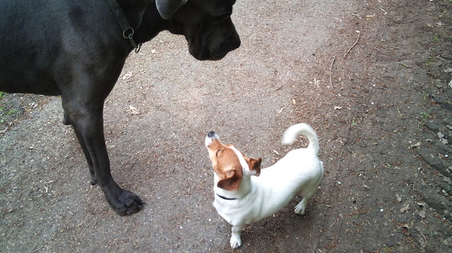 moet toegeven...het lukt haar niet altijd hoor om zo ontspannen te reageren op zo'n grote hond! haha