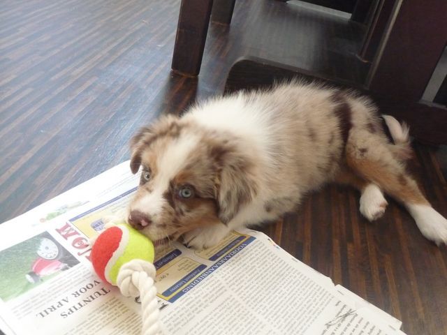 Vandaag Charlie opgehaald. Charlie is een Australian Shepherd, red merle. De rit naar huis ging best goed, hij heeft zich prima gedragen, maar was wel hyper omdat hij zoveel nieuwe dingen zag. Hier thuis heeft hij dan ook maar heel even rond gelopen, om daarna in slaap te vallen.