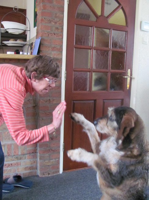 3 doggies Super Joke! Wat leuk dat je Taat dit geleerd hebt. Puzzle kan ook high five (houd ik mijn vingers omhoog) en de touch (houd ik mijn vingers naar beneden). Kunnen Taat en Puzzle elkaar een keer de high five geven