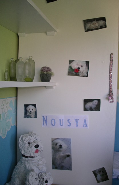 Ik heb foto's van Nousya en een halsbandje van Nousya op de kast geplakt: