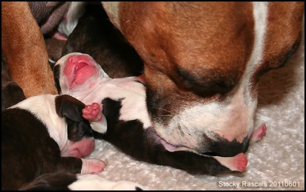 Ze had in totaal 12 (6 r & 6 t) puppies, waarvan ze er 10 (5 r & 5 t) levend op de wereld heeft gebracht. Bevalling verliep moeizaam. De 10de pup is dood geboren (was te lang uit de vruchtzak) en de laatste ook. Met dat ik deze morgen met haar naar de DA reed, omdat ik merkte dat ze bleef persen en uiteindelijk enkel groen water kwam, heeft ze de 12de pup in de auto uitgeperst, ook dood.