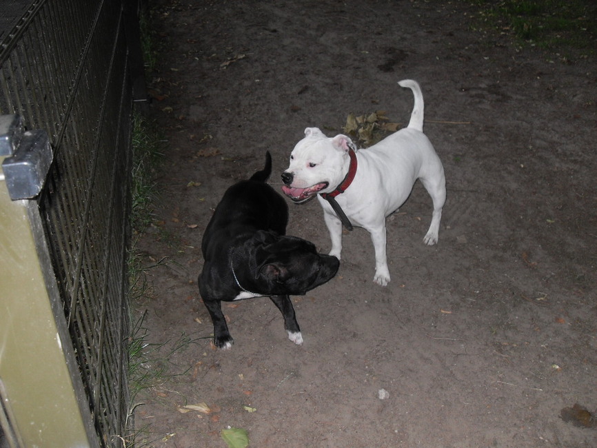 maar nu stond er een dame met engelse staff teef in de ren rond zich heen te kijken. maar kwam met hummer en diva aan. en hummer keffen. dus ze zei kunnen ze samen. ik zei nou niet me hummer. want die keft. dus ik hummer ff laten plassen en terug gegaan met diva. nou eerst in d eren samen laten snuffelen aan de riem toen dat goed ging na een paar minuten diva los en toen haar teefje.. en het ging hartstikke goed. diva is meestal stoer en gaat meestal gelijk met haar borst vooruit staan om te laten zie wie ze is. kittige katty hahaa. maar ze konden super goed met elkaar opschieten. en zijn we super blij mee. dus ze heb er eindelijk een vriendin erbij. zal fff een foto showen. gr myriam