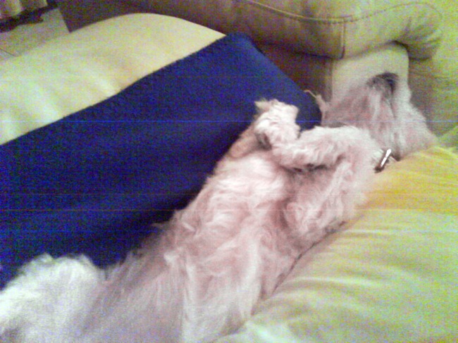 Komt me allemaal bekend voor, ik heb wel eens gedacht aan een fotoboek met de titel: 'de honderd mogelijke en onmogelijke slaapstandjes van de hond'.