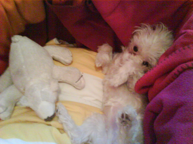 Jip kan niet op z'n rug met z'n achterpootjes wijdbeens liggen.