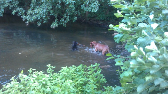 zodra hij een stokje had en ik hem afpakte rende ik het water in .......ghhehehhiih zo kreeg hij me niet te pakken.
