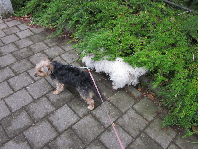 Helaas gaan Pucky z'n baasjes niet vaak met hem wandelen dus komen we hem ook niet veel tegen. Maar als we langs zijn huis doorlopen dan moet hij toch even loeren of hij geen blik van Pucky kan opvangen. Meestal zit ie wel in de tuin. Chipke wil er dan naartoe maar kan mijn hond moeilijk in de tuin van een ander laten hé.