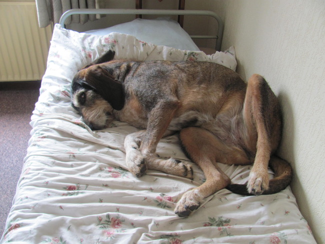 en misschien wel de belangrijkste, Punt 3...., waarom ligt zo'n grote hond op zo'n smal bed....,