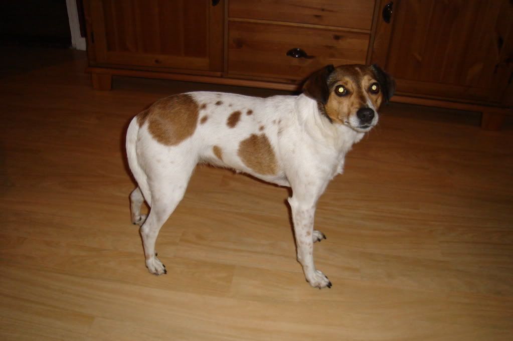Net even een klein rondje gelopen maar het ziet er echt wel zielig uit dat staartje zo tussen d'r achterpootjes. Alleen het onderste puntje van d'r staart kwispelt heen en weer maar verders hangt tie naar beneden. Net zag ze iemand in het schemer en normaal gaat d'r staart dan recht overeind nu kwam tie met moeite net tot halverwege