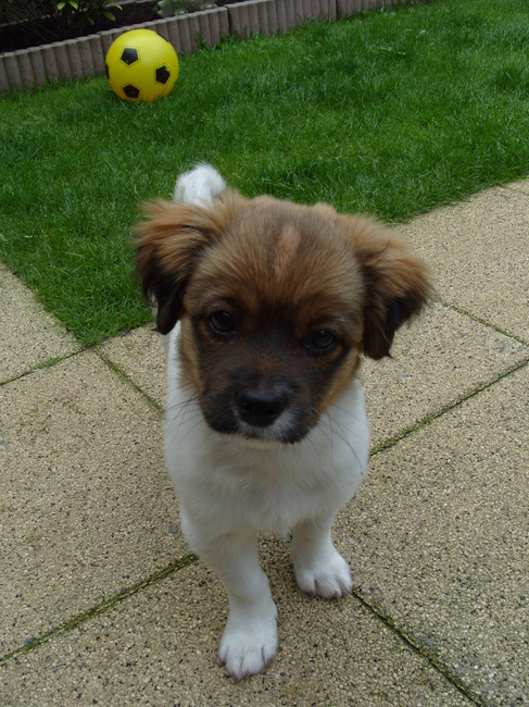 Het borstje en de stevige poten doen mij aan een Jack Russell denken, de oortjes aan een Kooikerhondje en zijn gezichtsuitdrukking aan een kleine spaniel, geen Tibetaanse maar meer een Cavalier of zo.