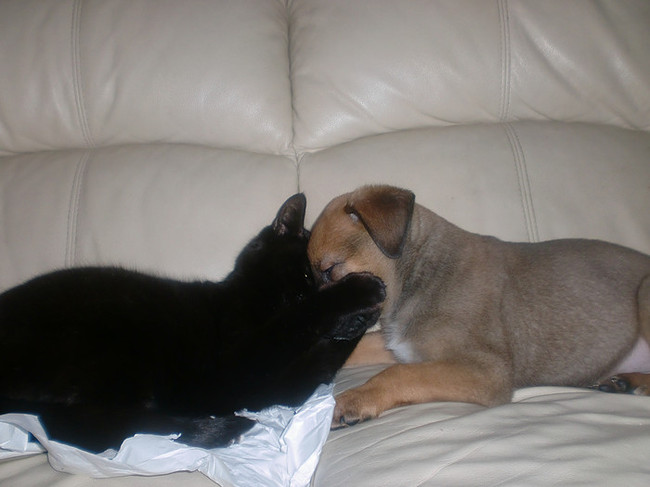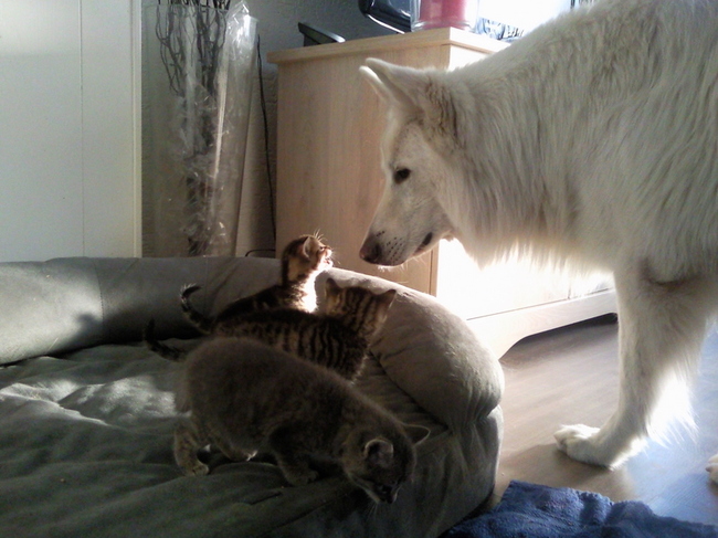 Wat een schattige fotootjes allemaal! Mijn hond heeft nog niet echt ervaring met katten, hij heeft er alleen op een afstand naar staan kwispelen...