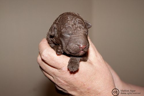 Voor een new foundlander is hij te klein, dus ik ga even alle bb-hondjes na, vanwege het res.bruin.