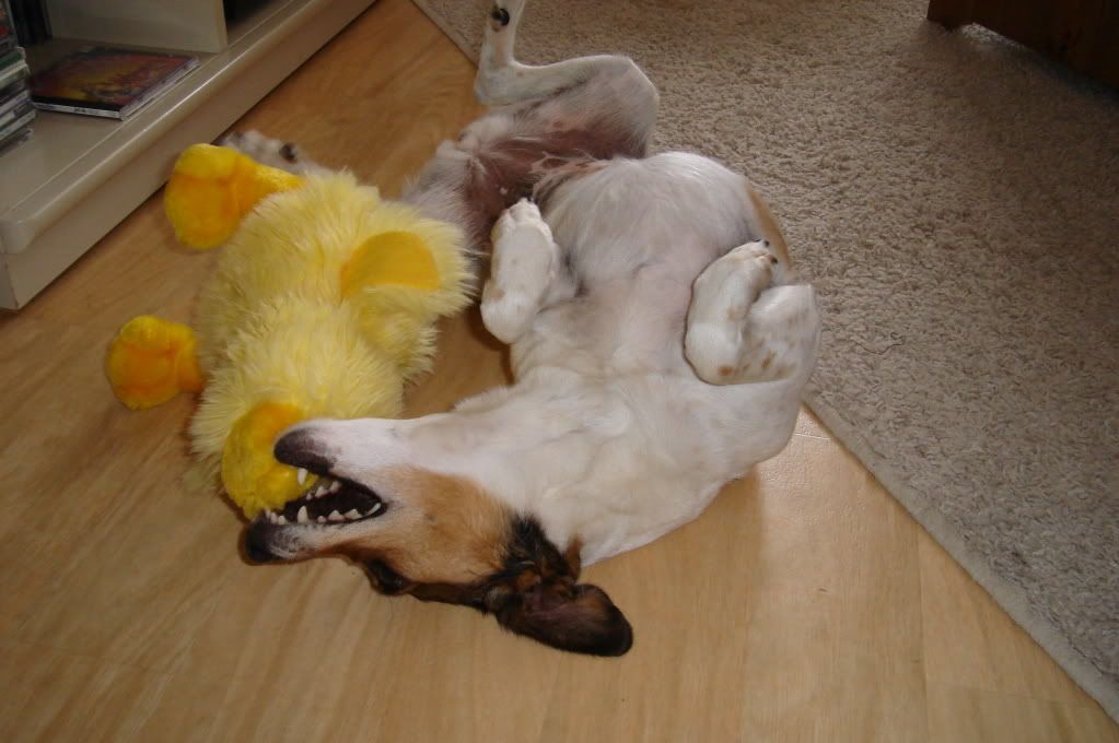 En ik heb ook geen digi foto van SPikeals pup met een knuffel, wel Spike met een speeltje van de Mac met piepertje erin.