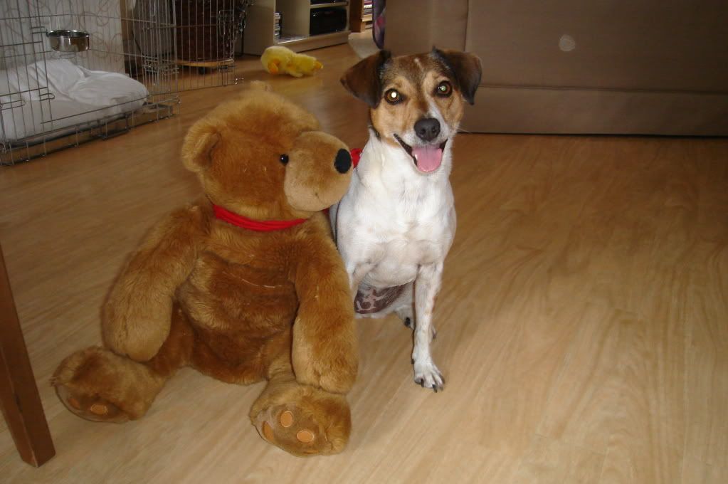 Ik heb wel een foto van Brandy als pup met een knuffel.