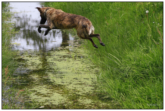 op een gegeven moment staat ze bij de sloot ik zeg weer NEE en ze loopt verder Jara, NEE! jara loopt nog iets verder ik loop er heen om haar aan telijnen en het is plons
