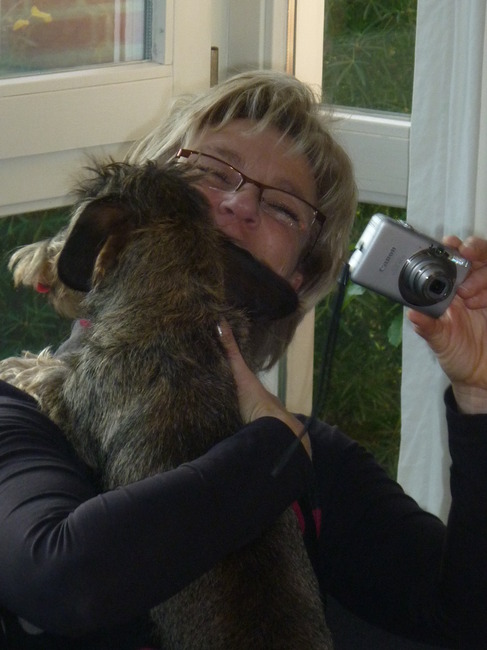 ik heb ook geprobeert om samen met Buddy 'n foto te maken maar omdat Buddy zo druk doet bij haar zijn die bijna allemaal wazig... eentje heb ik nog maar daarop zit Buddy, Emmy lekker af te lebberen...