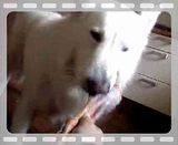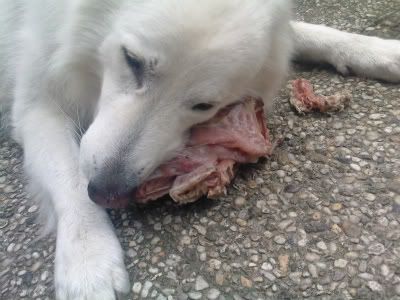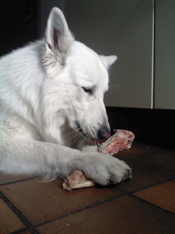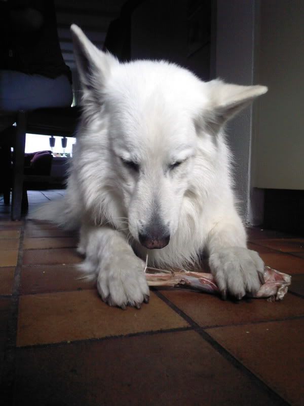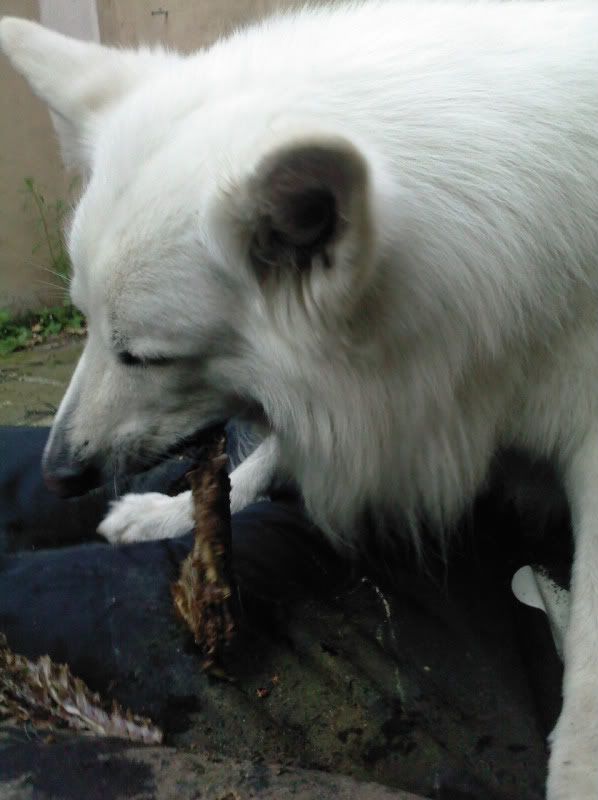 Ik had Daantje eergisteren ook die kalkoenvleugel gegeven. Eerst likken, wel even wennen zeg, wat vreemd. Na 10 mins likken en sabbelen had ze hem goedgekeurd en..: