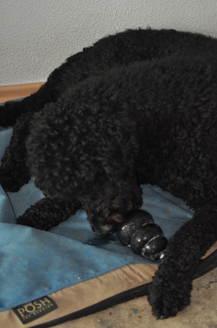 Mojo krijgt soms ook een Kong! Ik maak voor hem dan een Kong met pindakaas en banaan! Dat vindt hij heel lekker