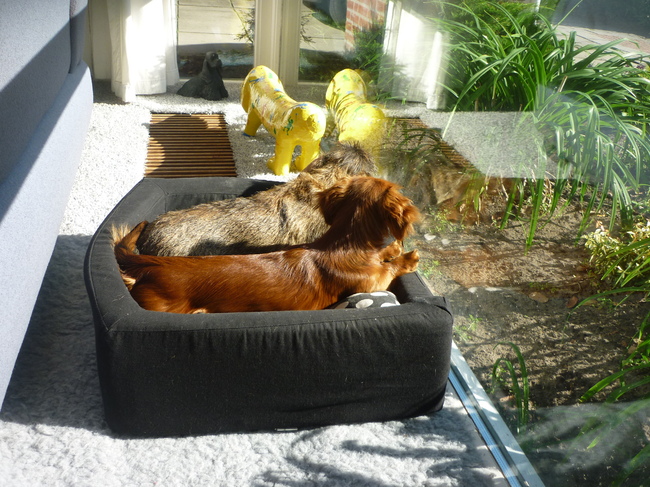 Hier staan ze bij de schutting zodra ze de linkerburen horen of merken dat hun hond in de tuin is.