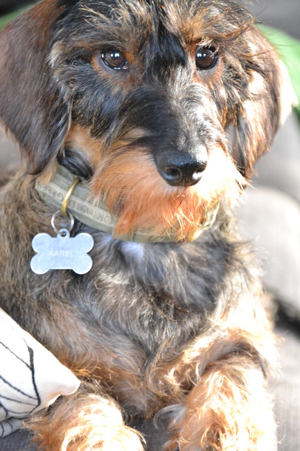 Zodra ik zit, komt hij op me zitten. En er is bij Karel een zeer duidelijk verschil tussen op schoot zitten en óp mij zitten. De boodschap is dan zeer duidelijk: zitten blijven en waag het niet om op te staan. Stoere vent als hij is, is hij druk bezig met mij beschermen tegen de boze buitenwereld. Ik luister daar natuurlijk niet naar, dat mag duidelijk zijn, ik laat me niet rond commanderen door een Teckel, maar het doet wel wat met me dat hij zo goed aanvoelt hoe ik me voel en dat hij voor me probeert te zorgen. Ik heb nog nooit zo'n bijzondere, sterke band gehad met een hond als met Kareltje. Kareltje is een bijzonder kereltje.