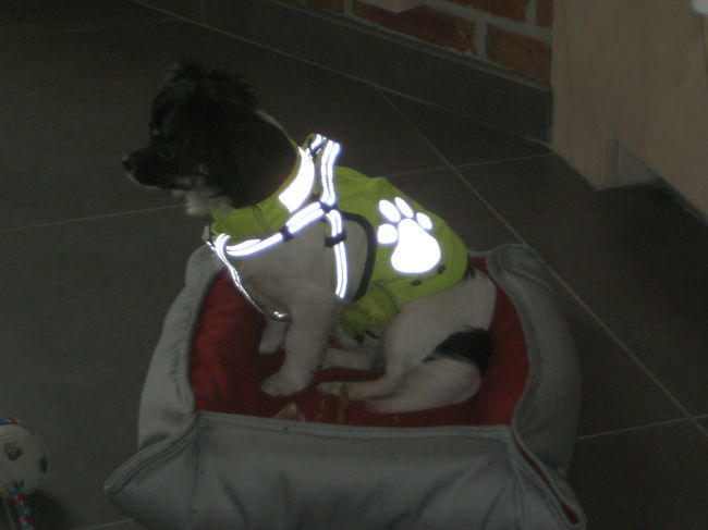 speciaal voor de foto haar vestje met fluo tuigje aan gedaan, lief hé