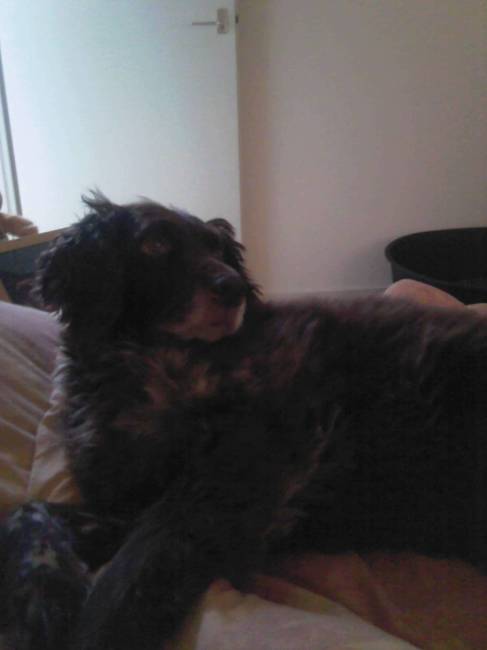 boven op me liggen. Hij werd loodzwaar maar ja geeft niet. Gaf me paar likken over me hand heen en schudde eerst met zijn kop nee nee nee. Ik van mannetje geef je nou maar lekker neer, ga maar je moet niet voor mij doorgaan. Je gaat naar een plek waar je geen pijn meer hebt, Ik zeg over een tijd kom ik ook daar heen, (mits hij niet naar zijn oude baas terug gaat) en dan zien we elkaar weer terug. Toen werd hij rustig en legde zich helemaal in mijn armen neer.