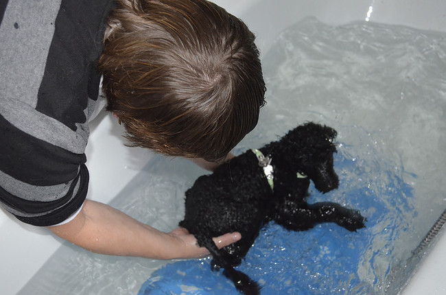Zwemmen in bad om zijn achterpootjes te versterken en dan in een warme handdoek. Om op te vreten zo lief.