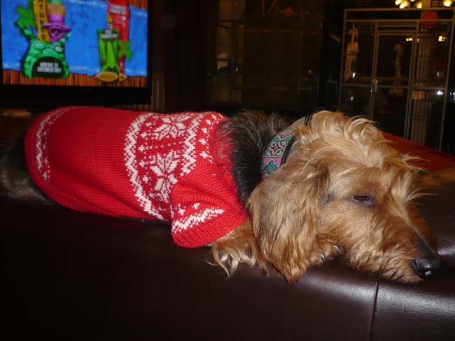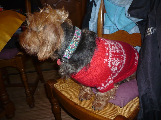 een rode trui met een Noors patroon, zie Sam en Saltarin er niet in lopen hahaha