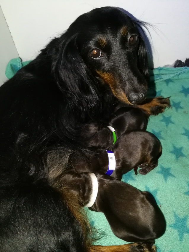 Thuis gekomen, bibi in de werpkist, pups gewogen, bandje aangedaan, enkele foto's genomen & dan bij haar gelegd.